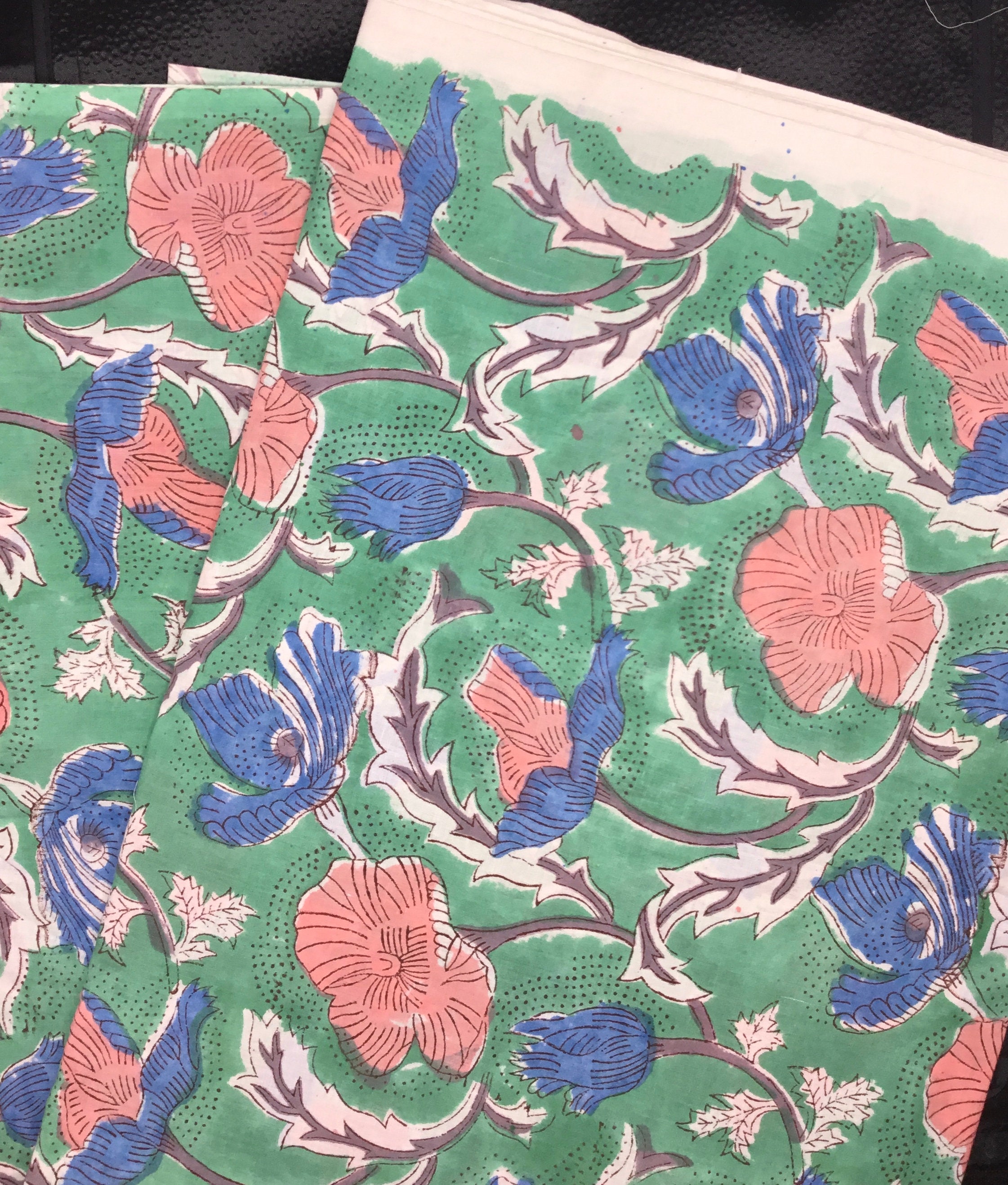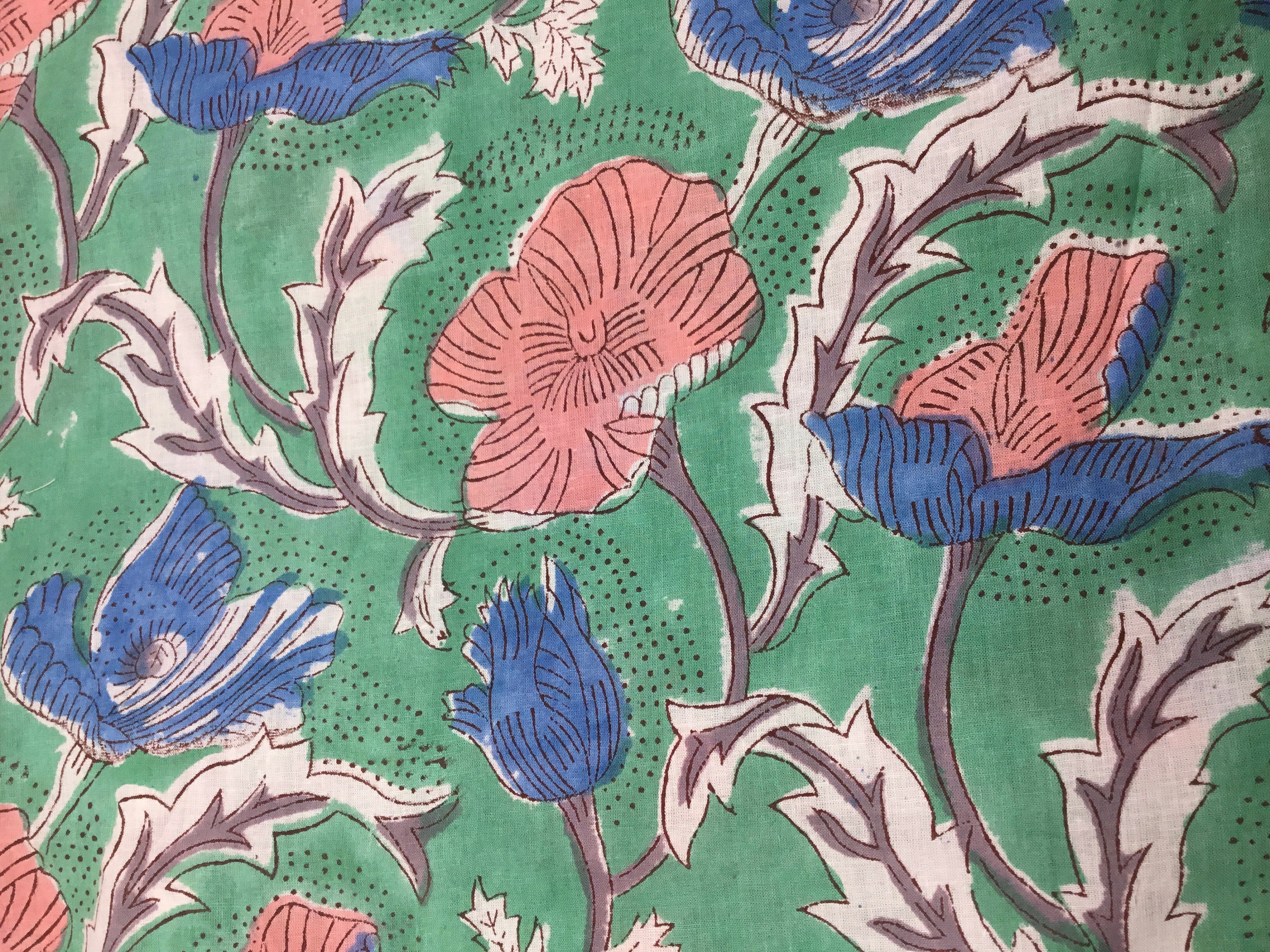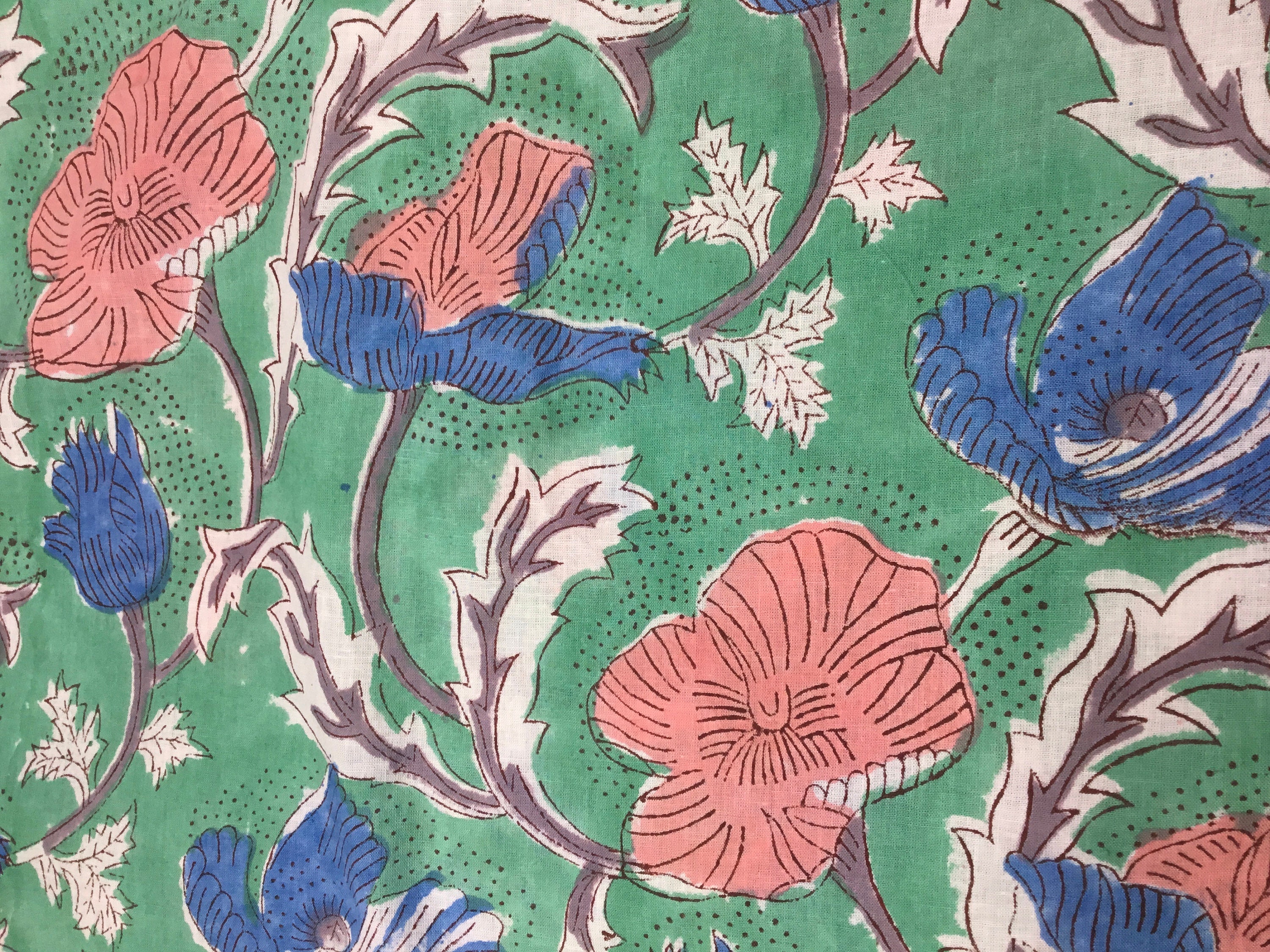 Block print fabric. High quality cotton voile, printed by hand in India, using hand made, carved tree blocks. Fabric manufactured in the Jaipur region. Only natural dies, no chemicals.