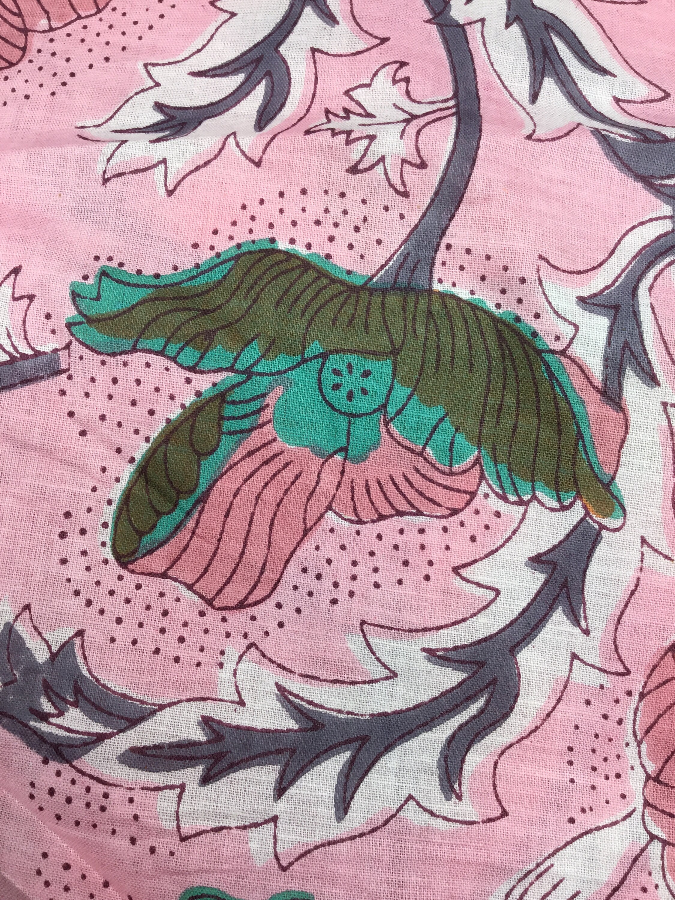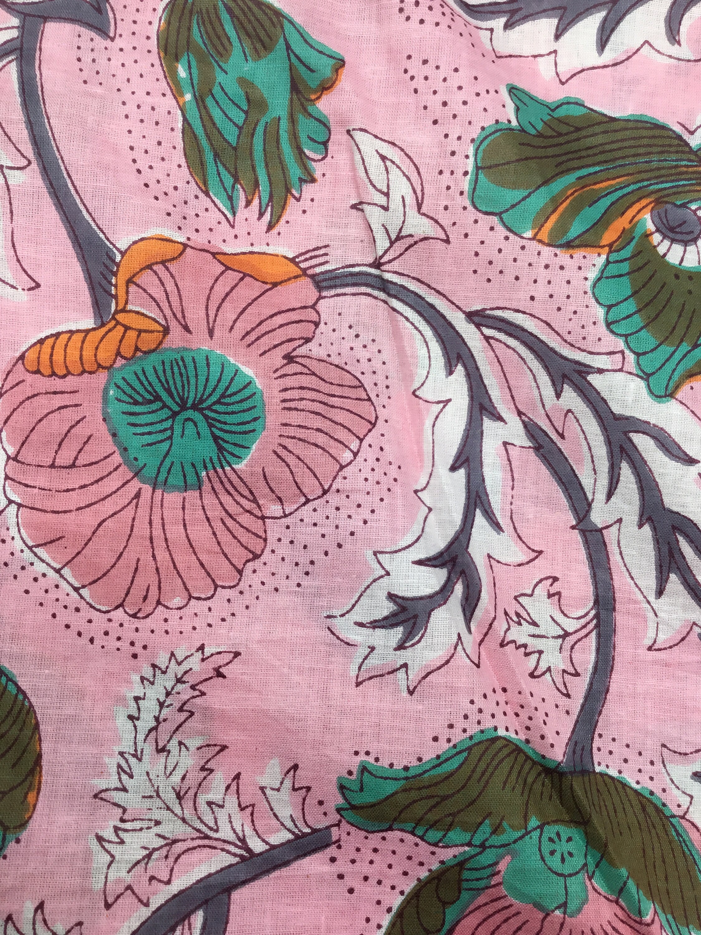 High quality cotton voile, printed by hand in India, using hand made, carved tree blocks. Fabric manufactured in the Jaipur region. Only natural dies, no chemicals.