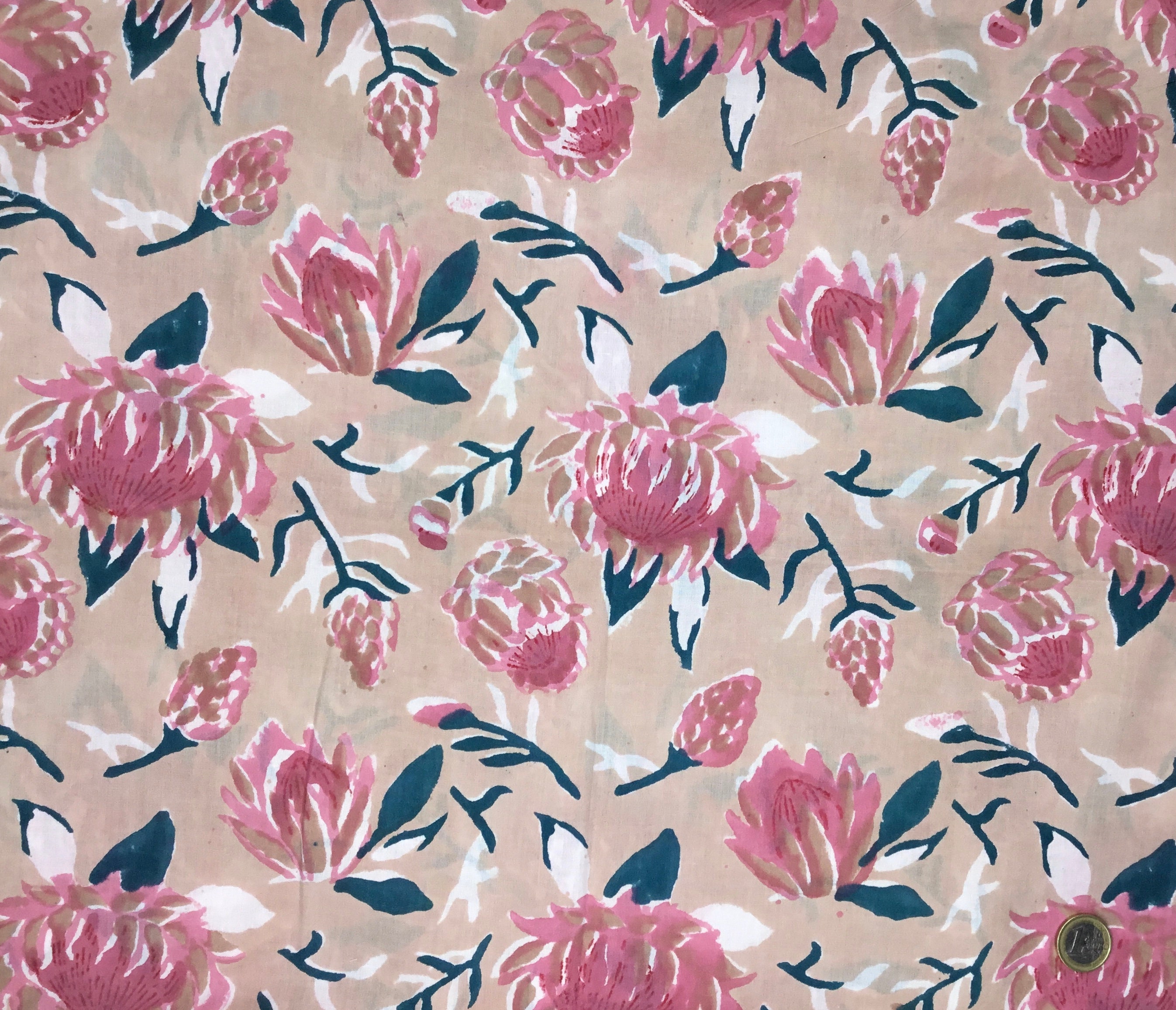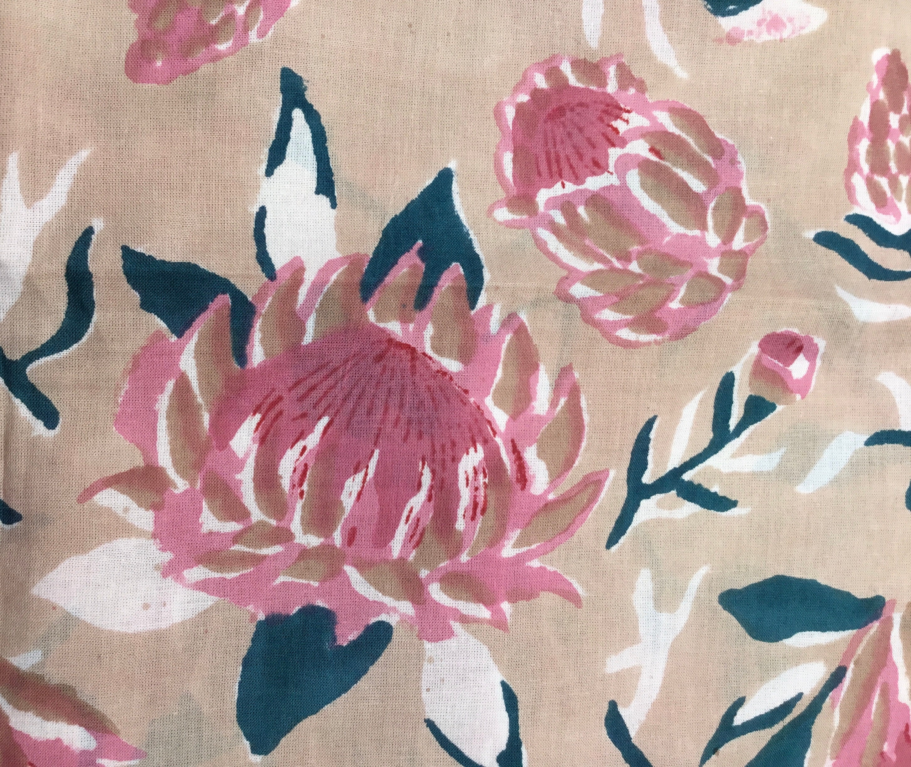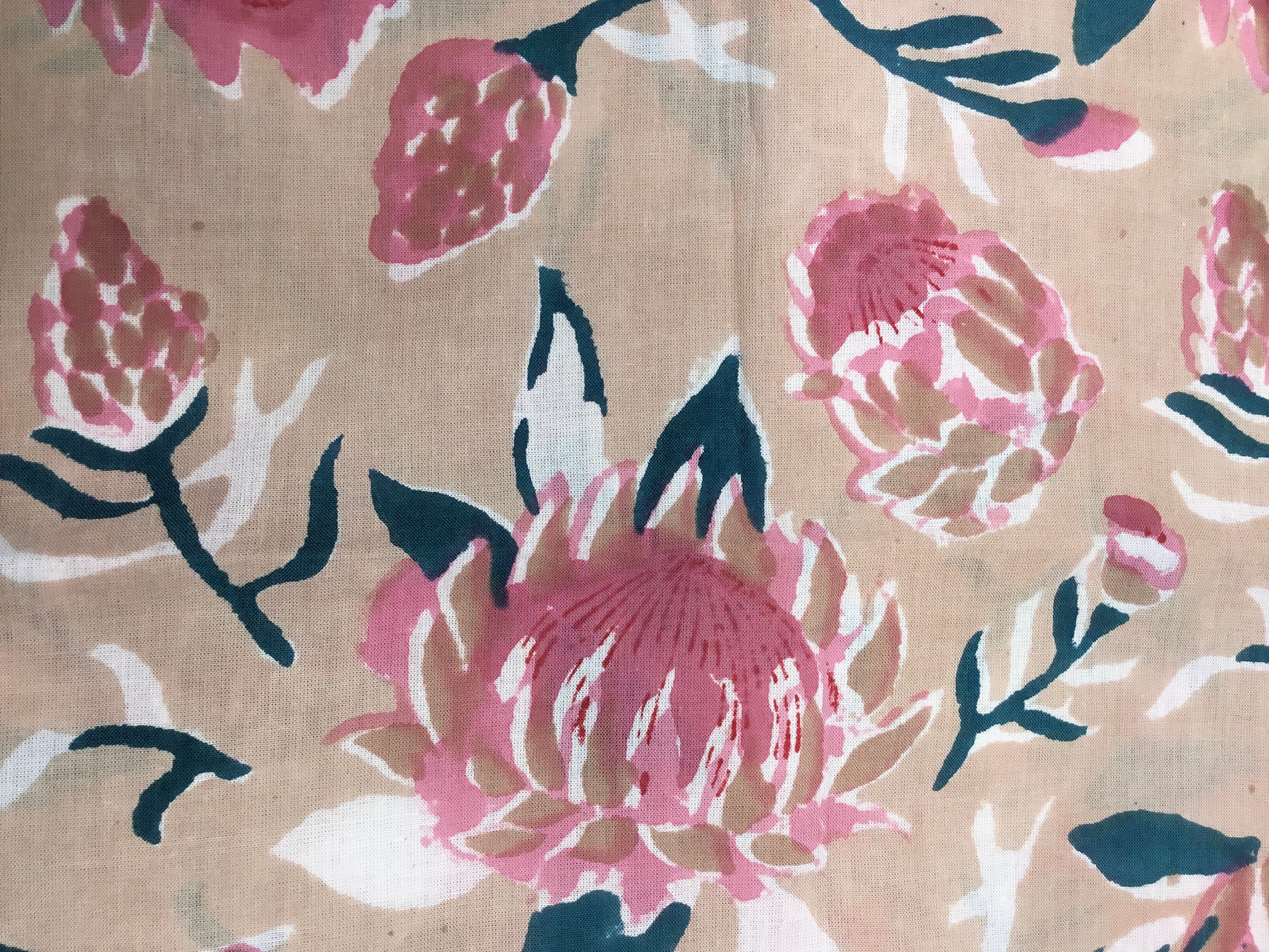 Indian block printed cotton muslin, hand made. Beige water lilies Jaipur blockprint