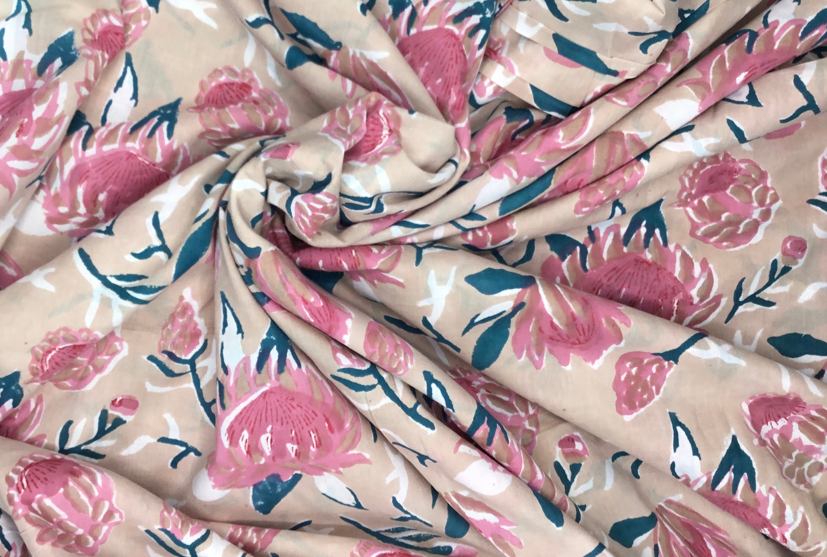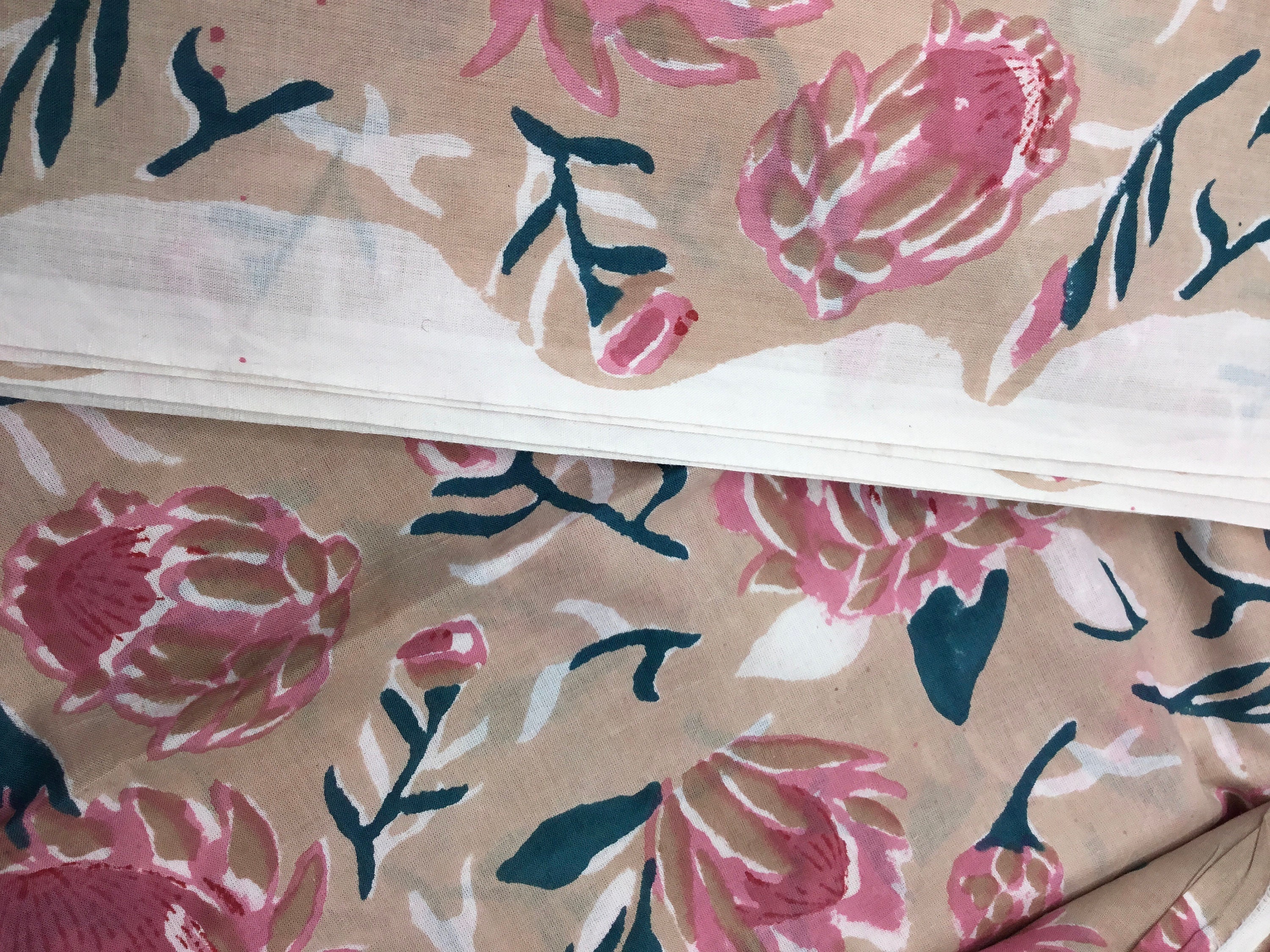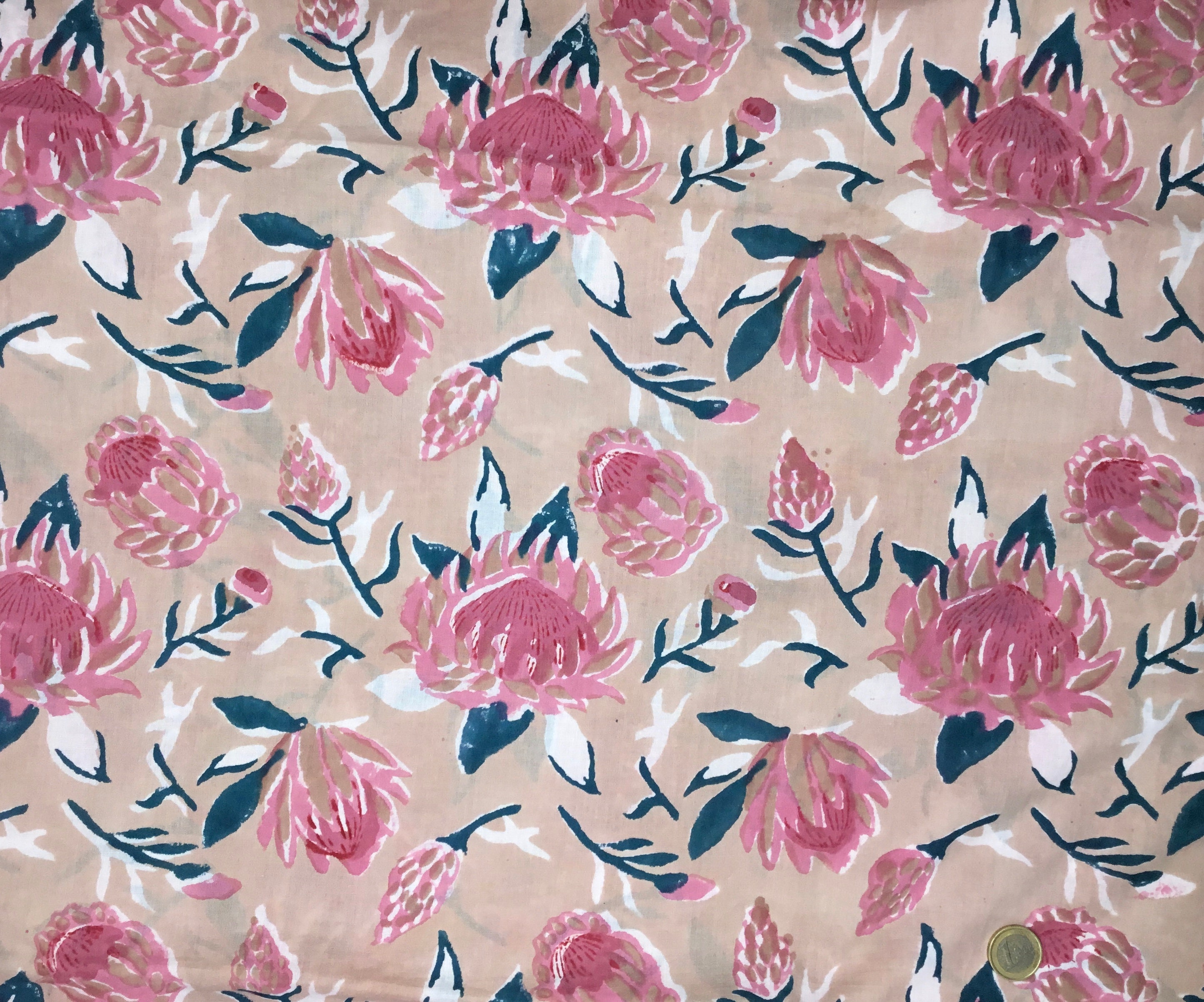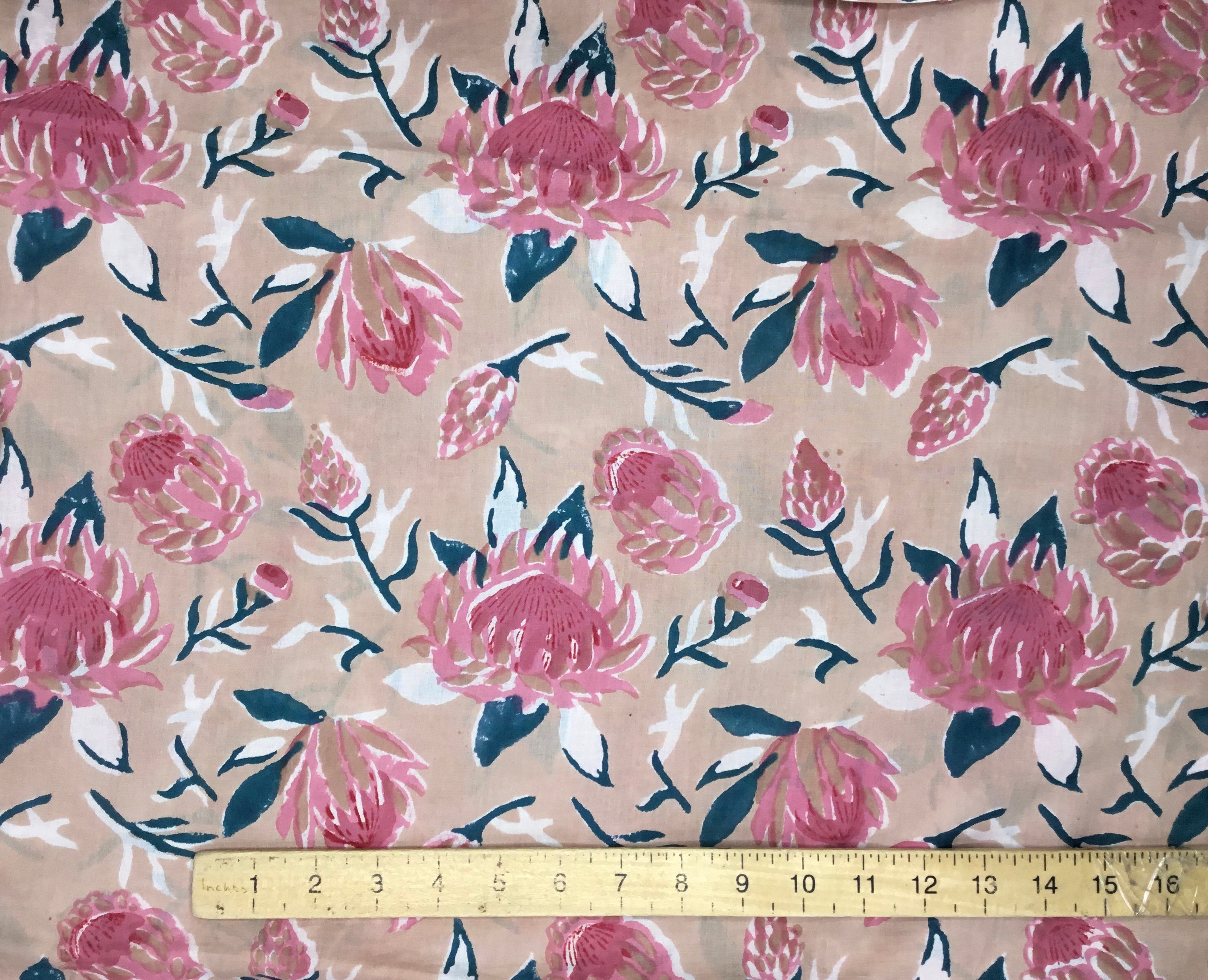 Indian block printed cotton muslin, hand made. Beige water lilies Jaipur blockprint