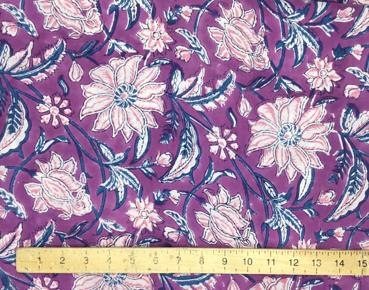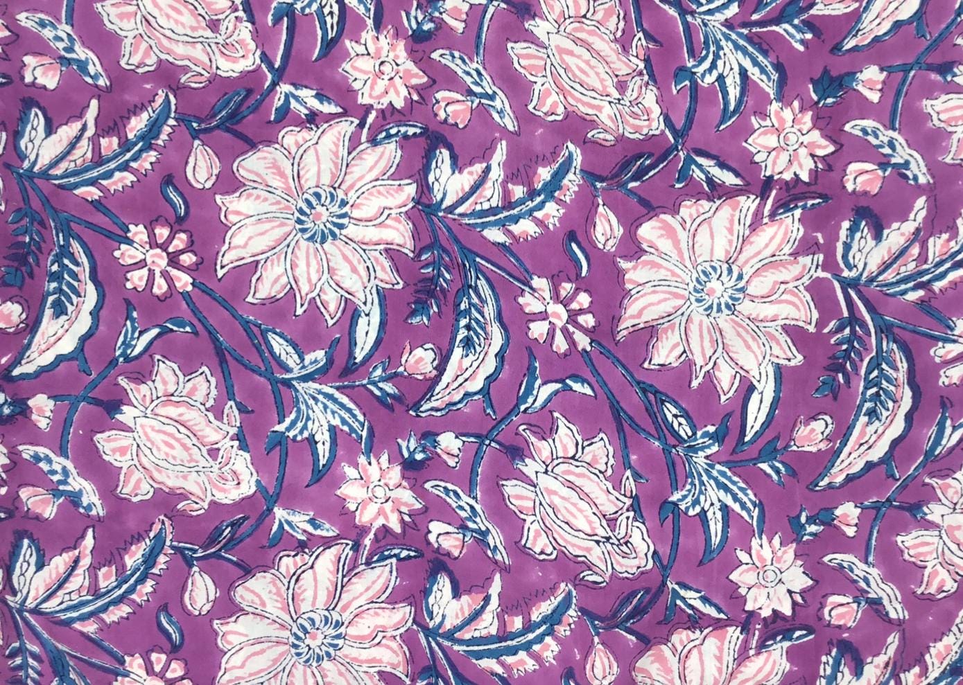Indian block printed, block print or blockprint cotton Jaipur, flowers on purple print, traditional blockprint from India