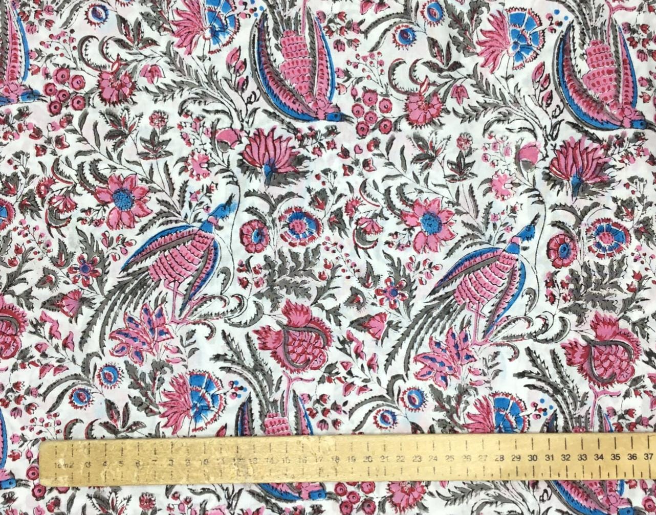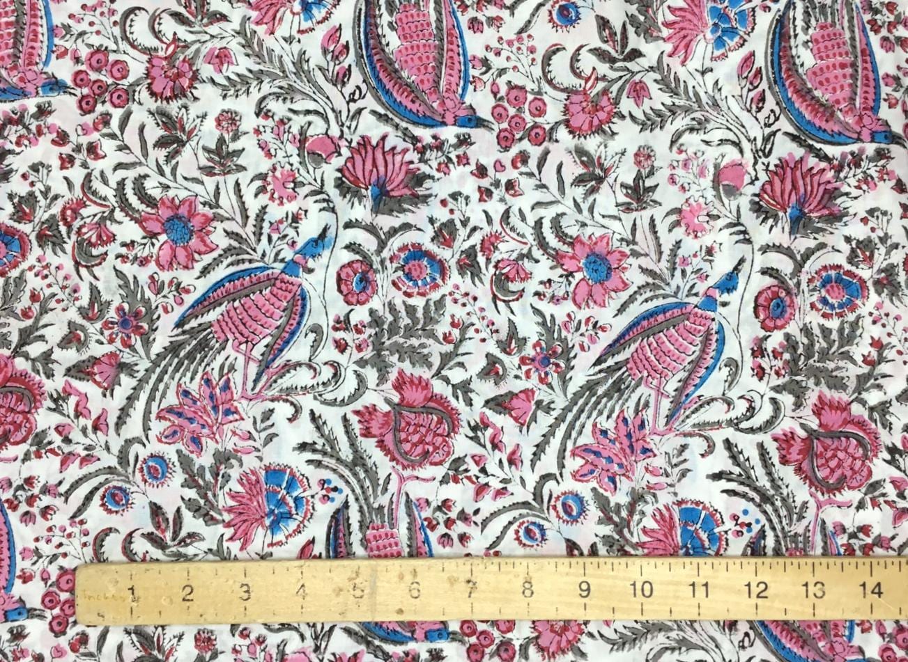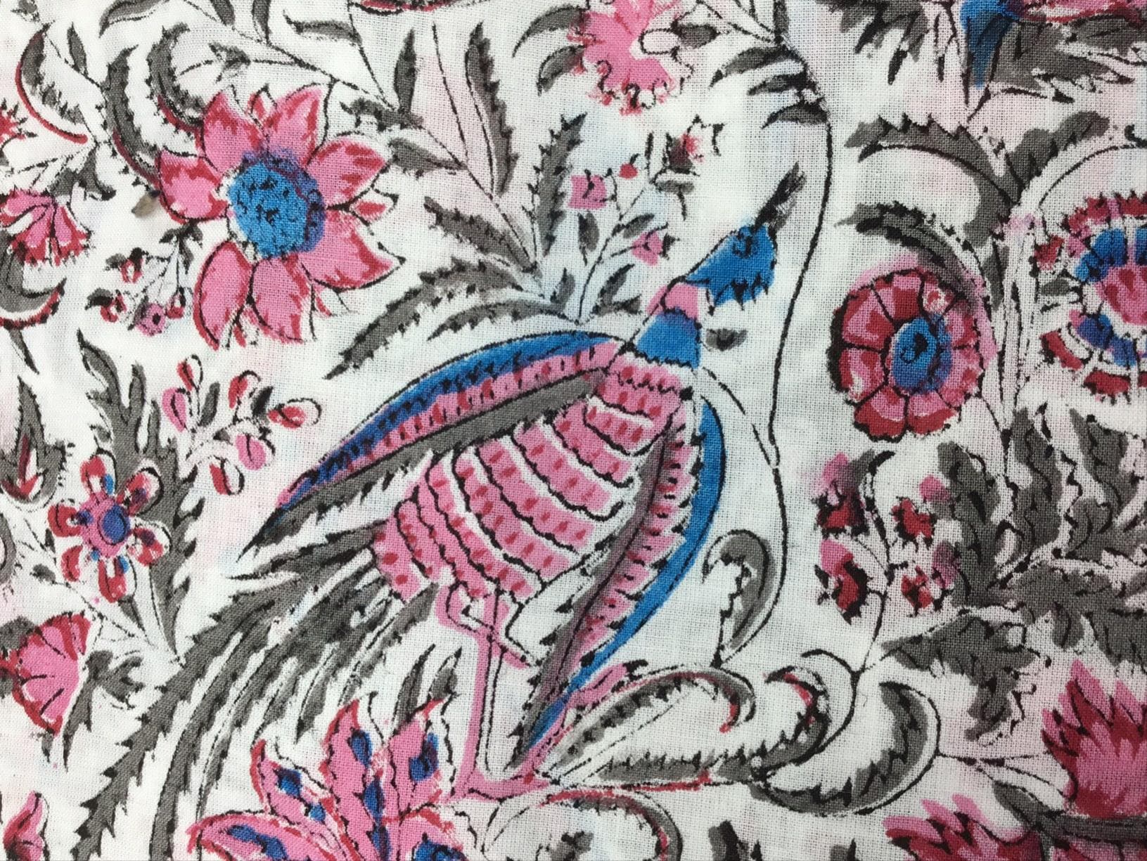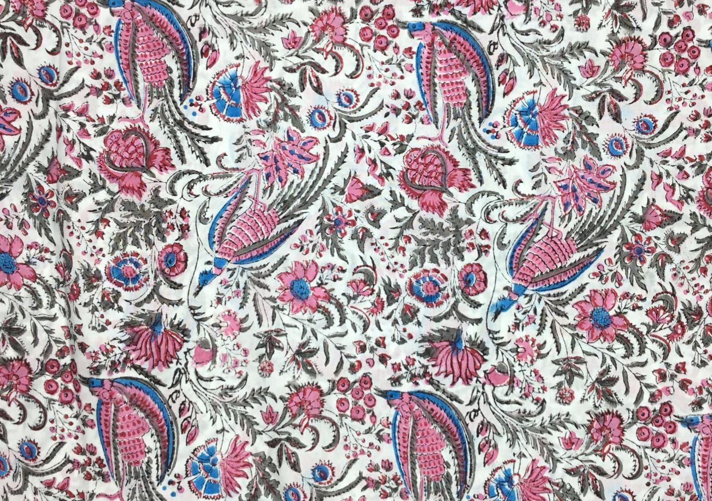 Indian block printed, block print of blockprint cotton Jaipur, blue indian floral on white. Indian block printed, block print or blockprint cotton Jaipur, exotic birds, traditional blockprint from India
