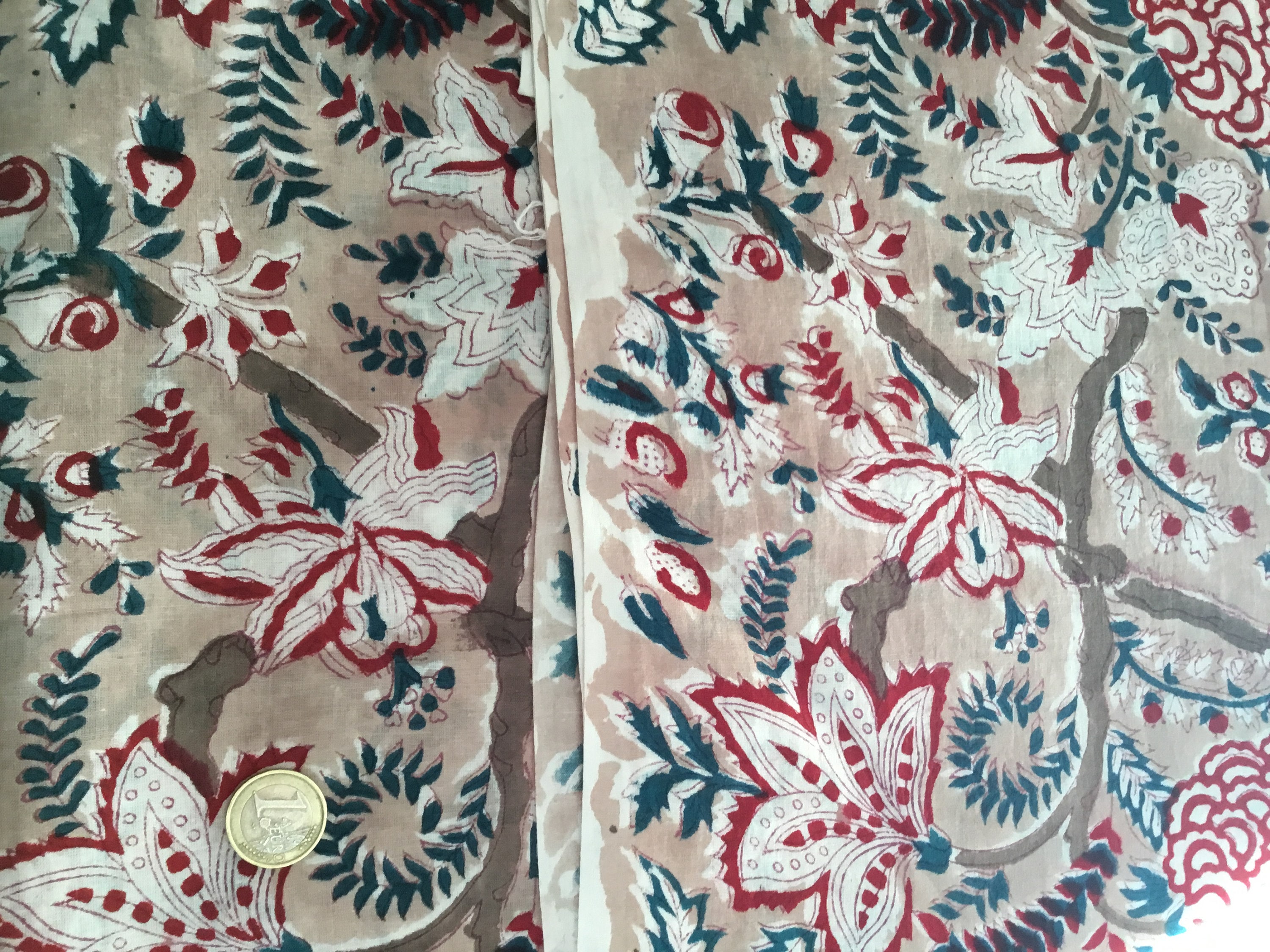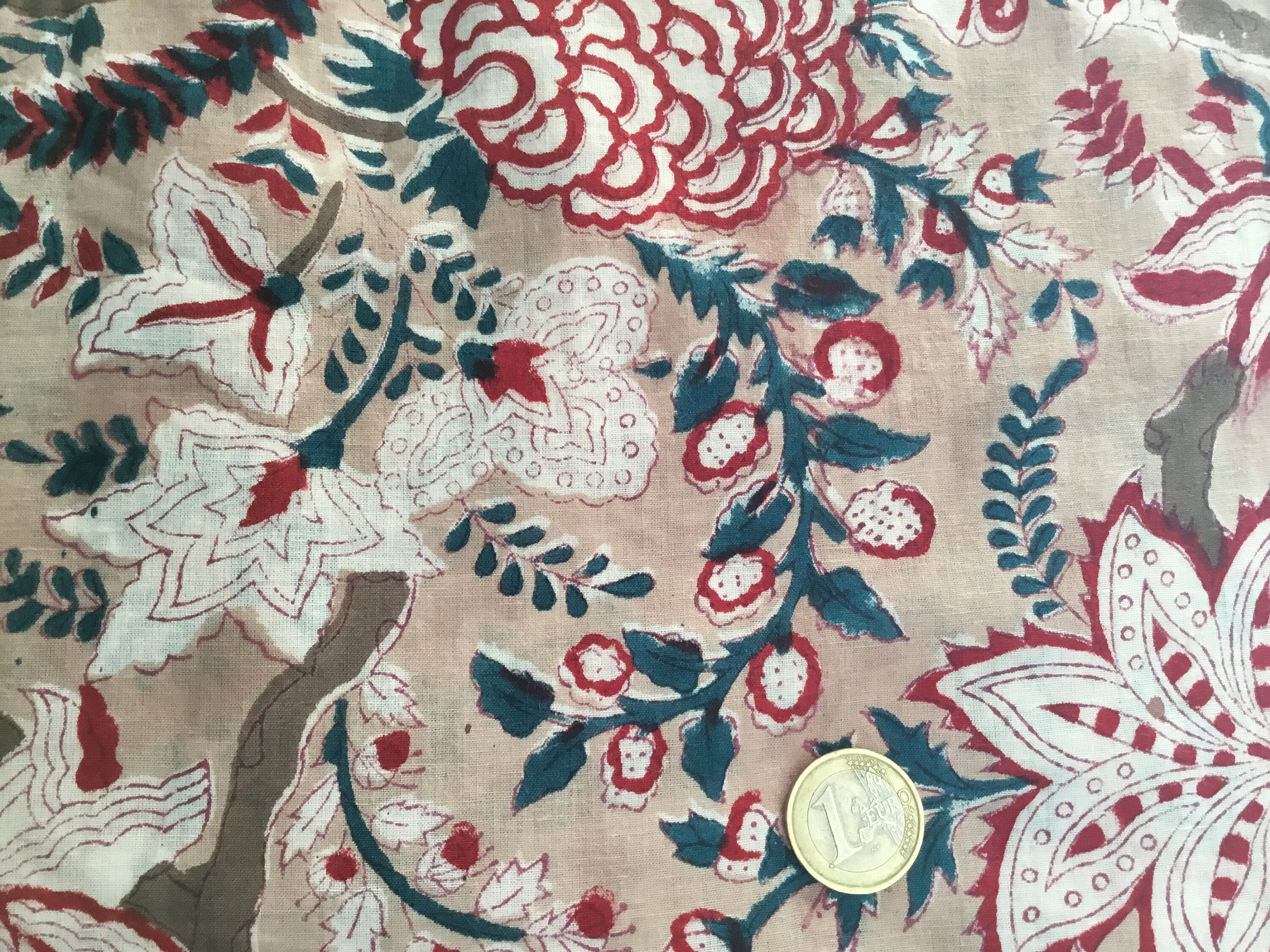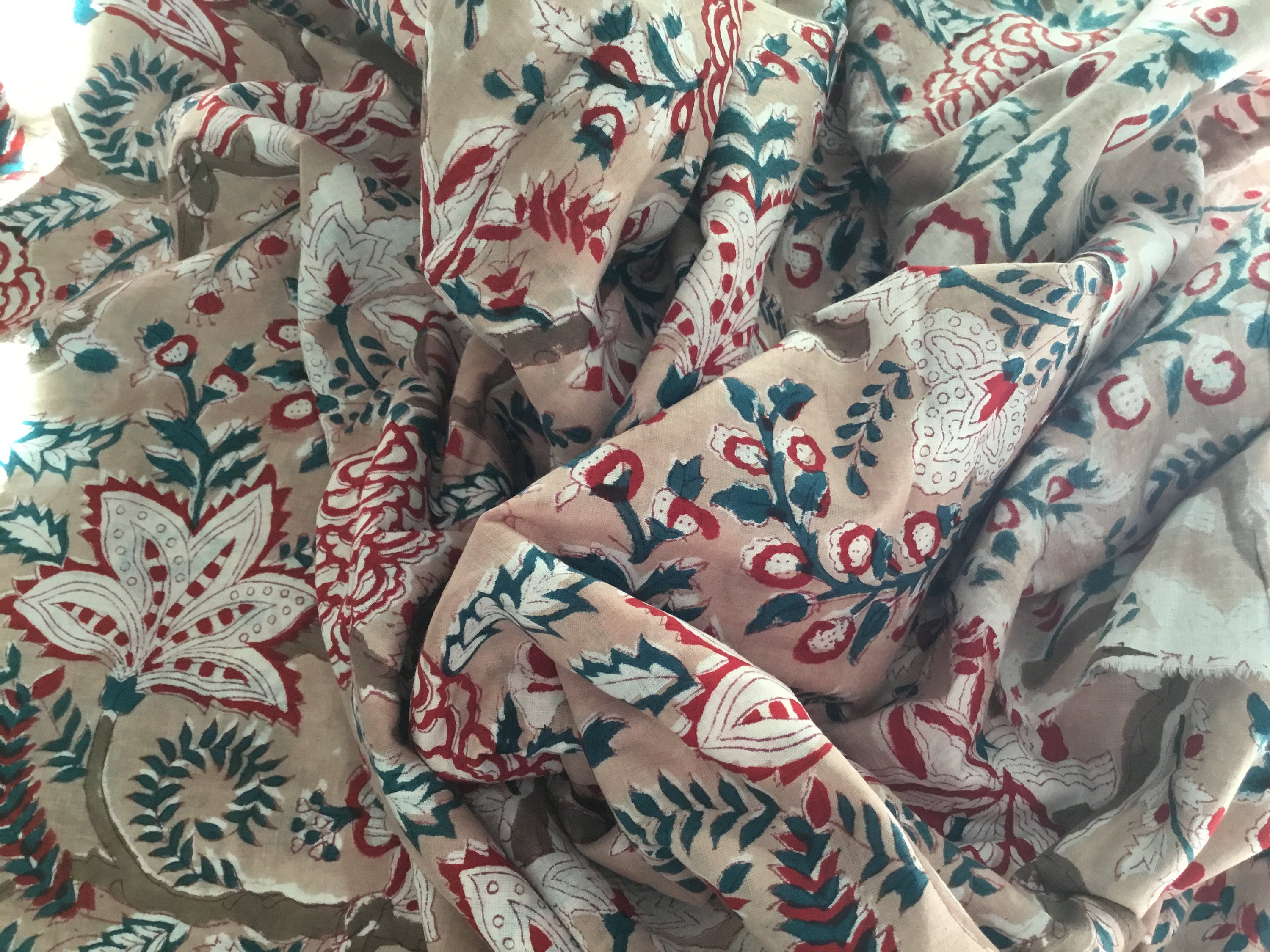 High quality cotton voile, printed by hand in India, using hand made, carved tree blocks. Fabric manufactured in the Jaipur region. Only natural dies, no chemicals.