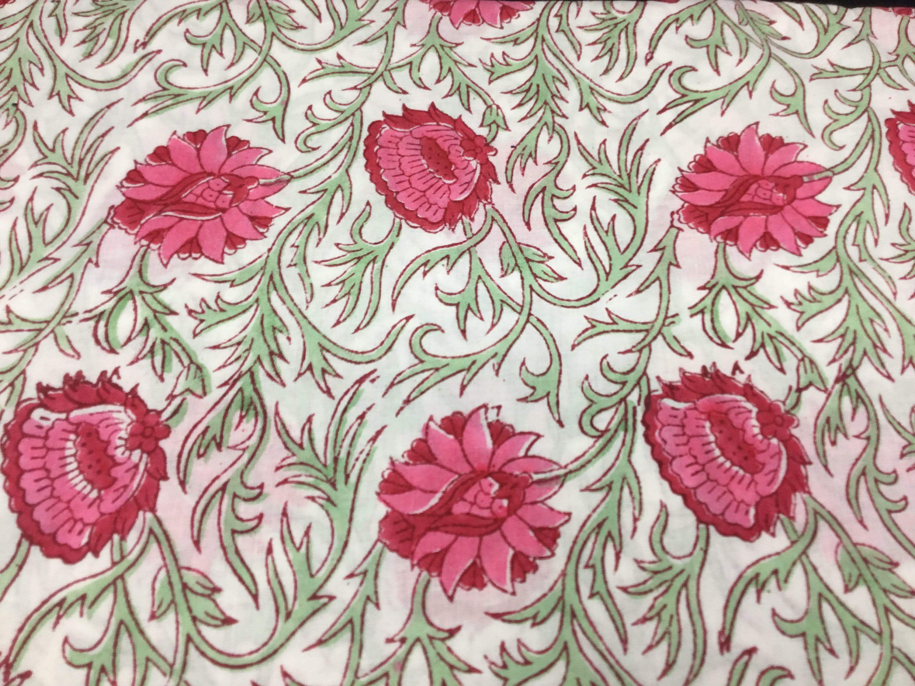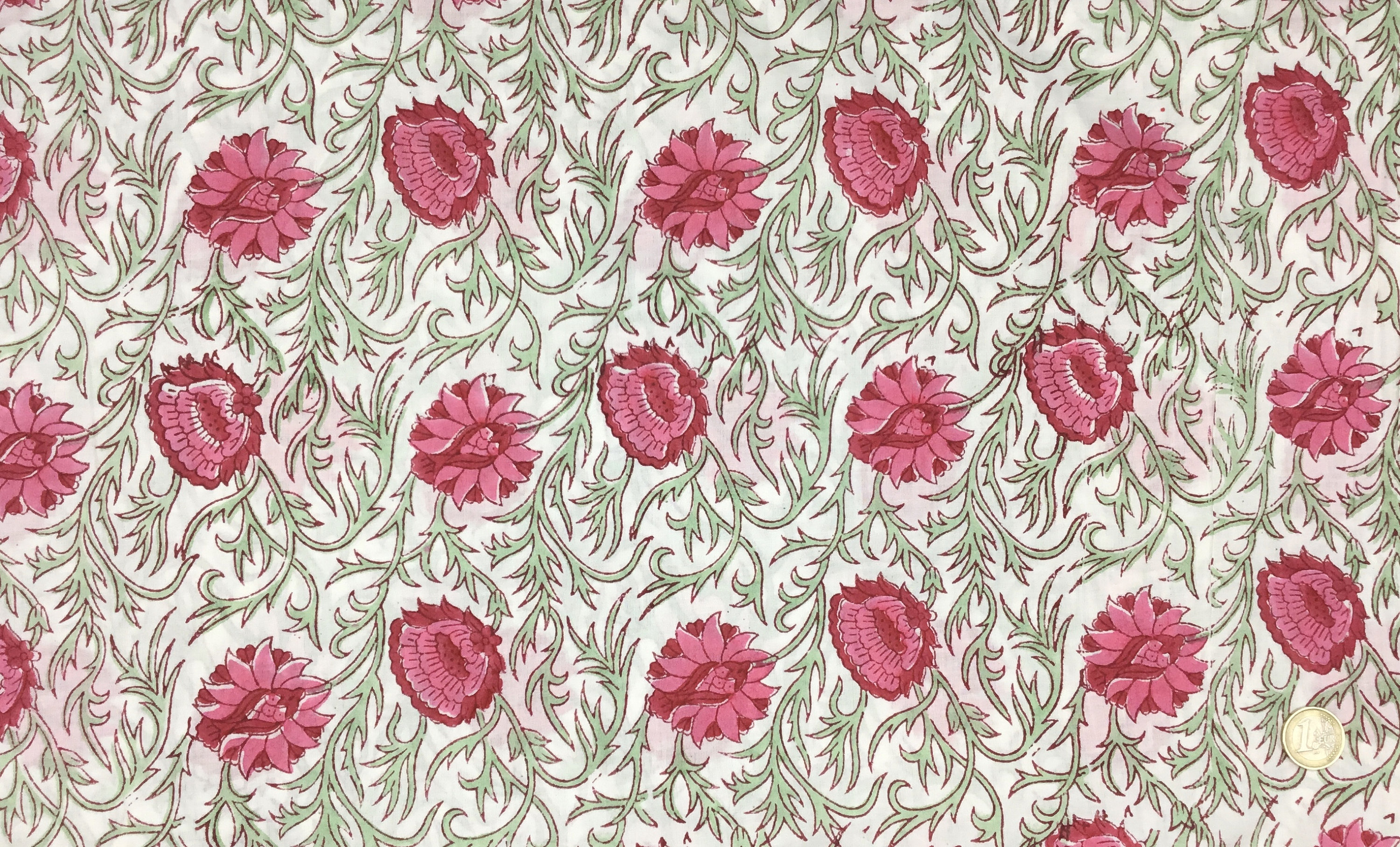 High quality cotton voile, printed by hand in India, using hand made, carved tree blocks. Fabric manufactured in the Jaipur region. Only natural dies, no chemicals.
