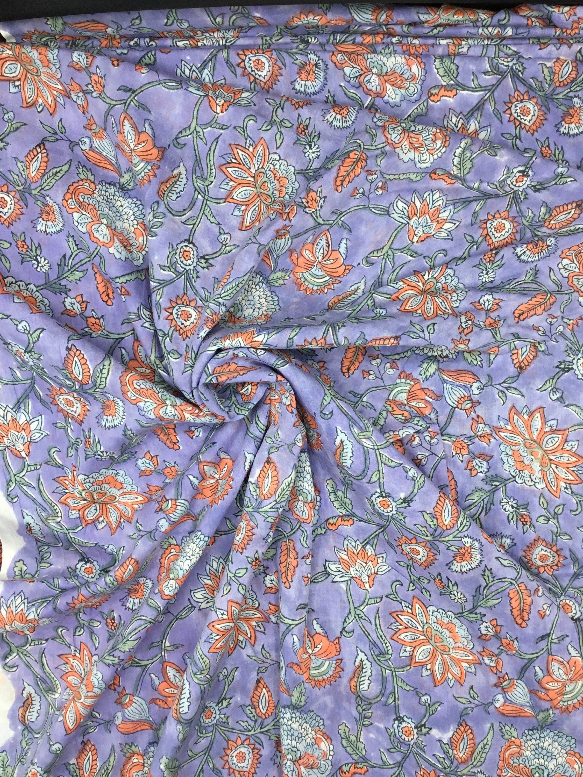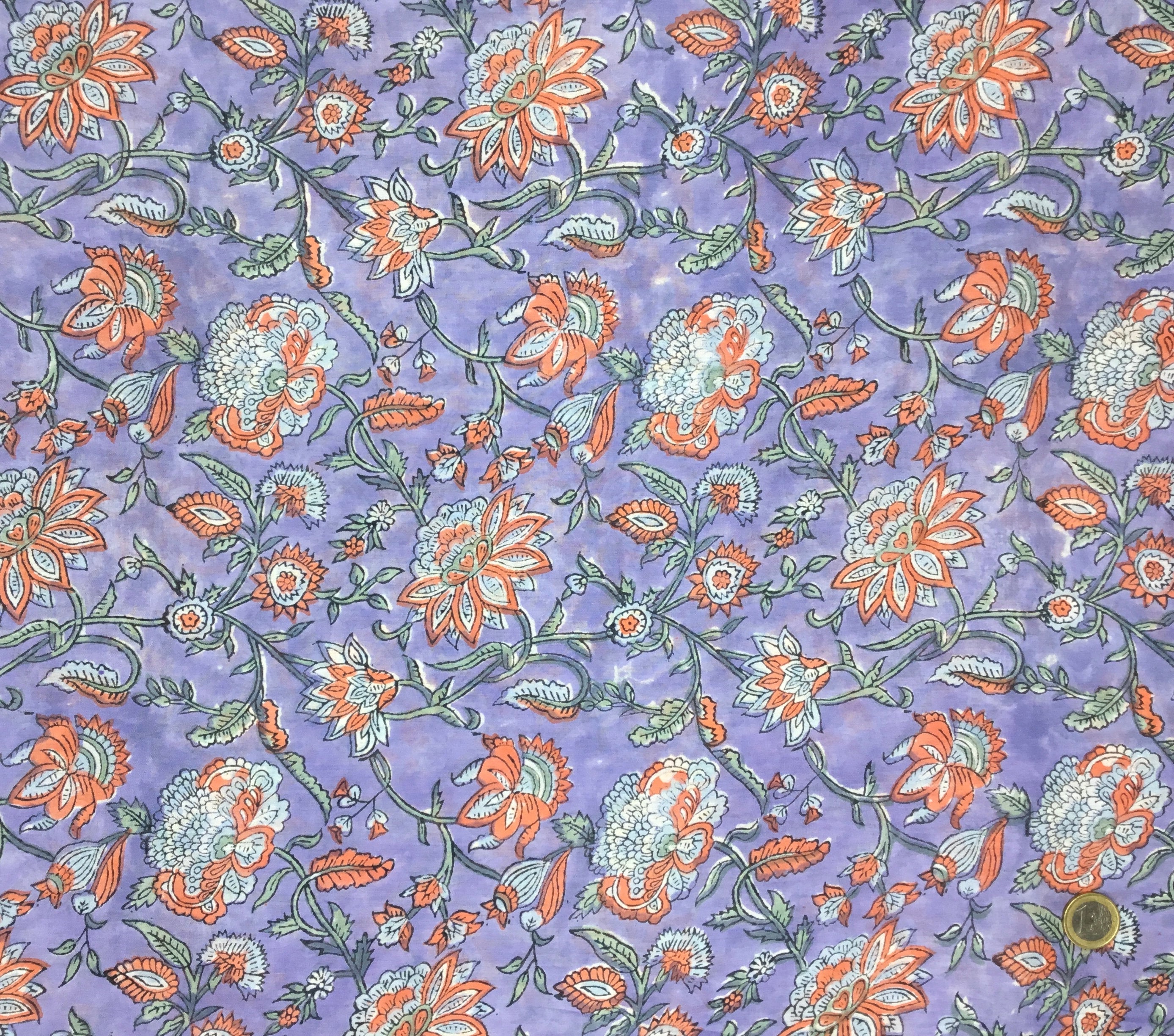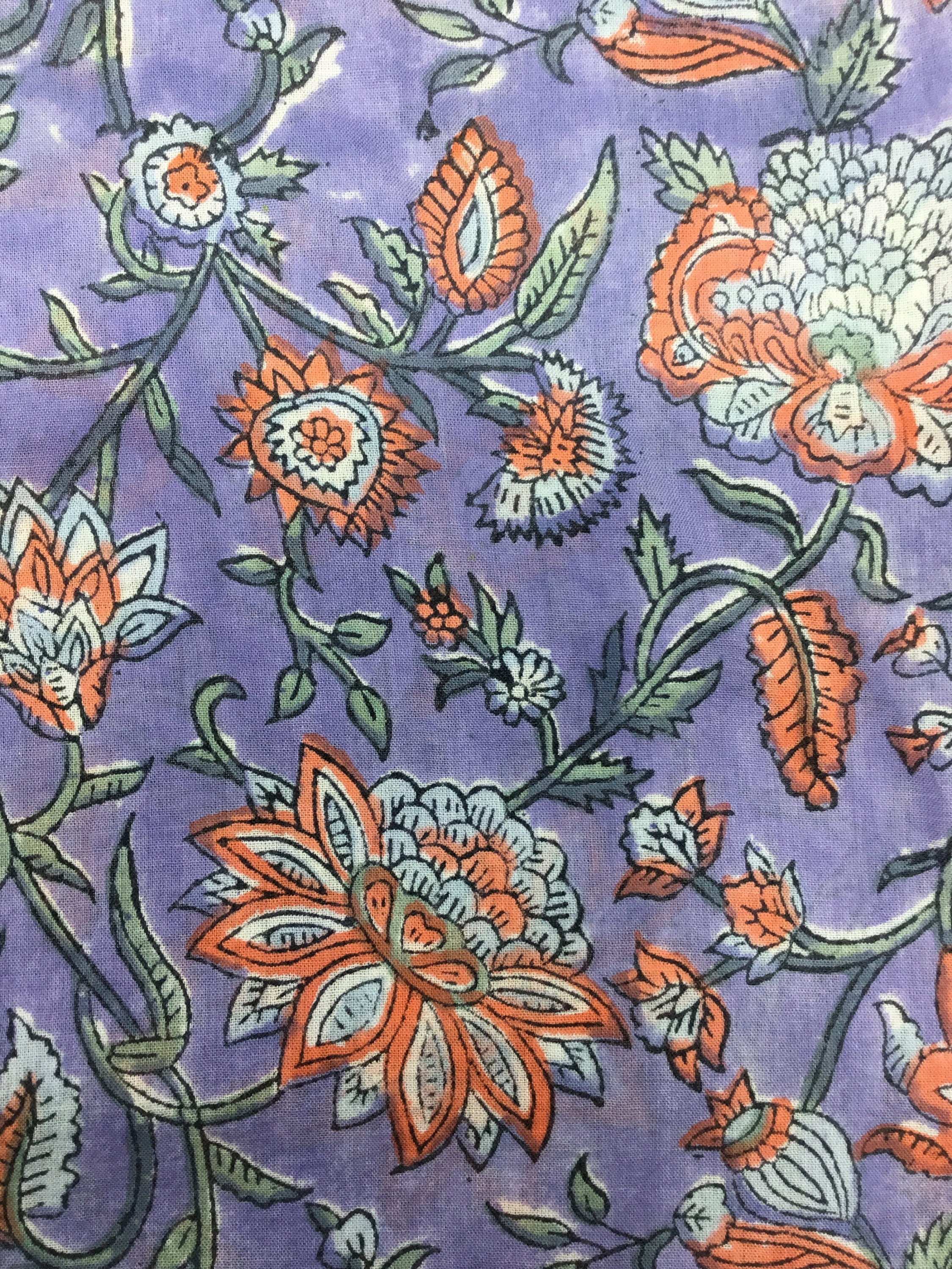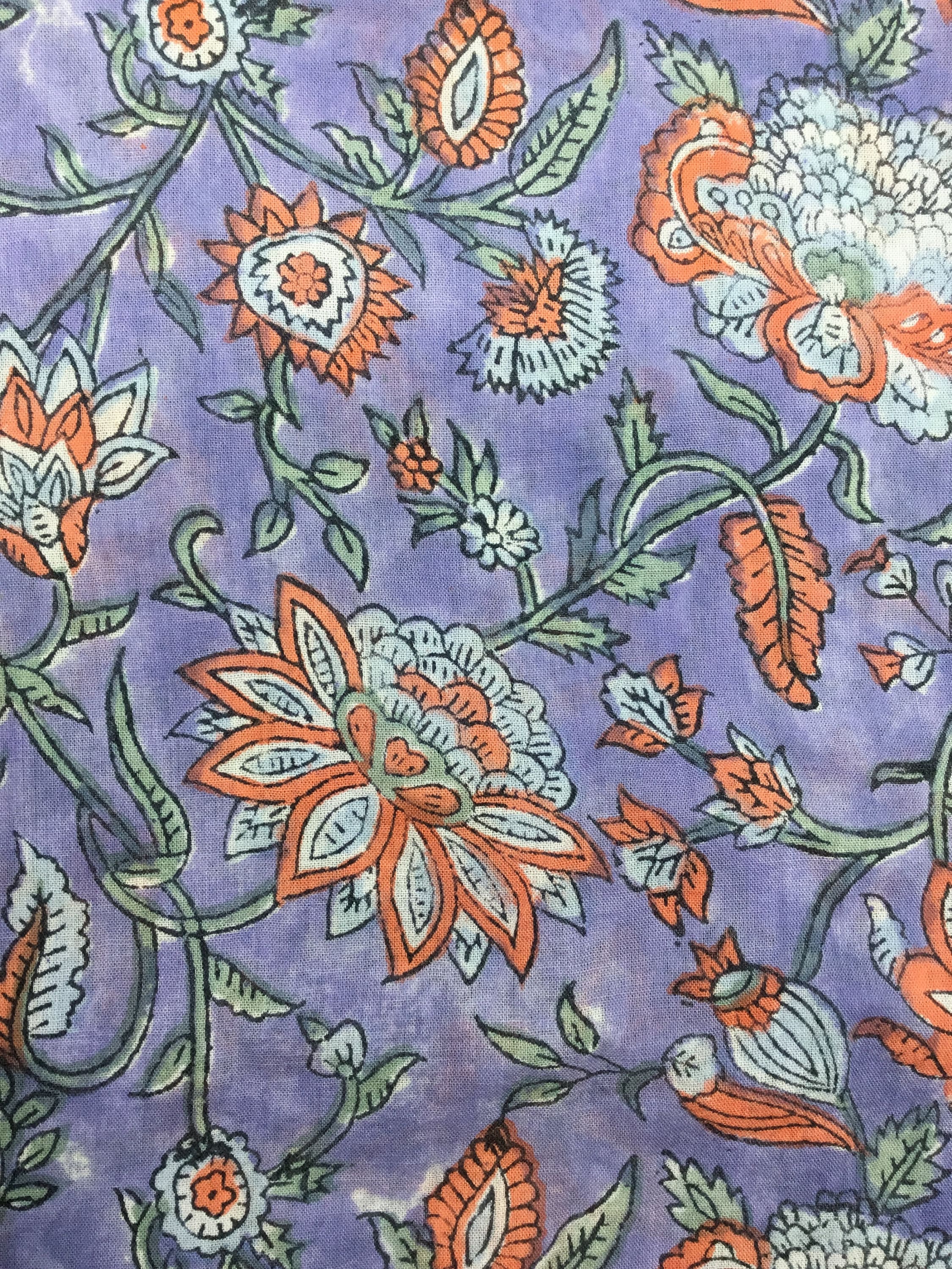 High quality cotton voile, printed by hand in India, using hand made, carved tree blocks. Fabric manufactured in the Jaipur region. Only natural dies, no chemicals.