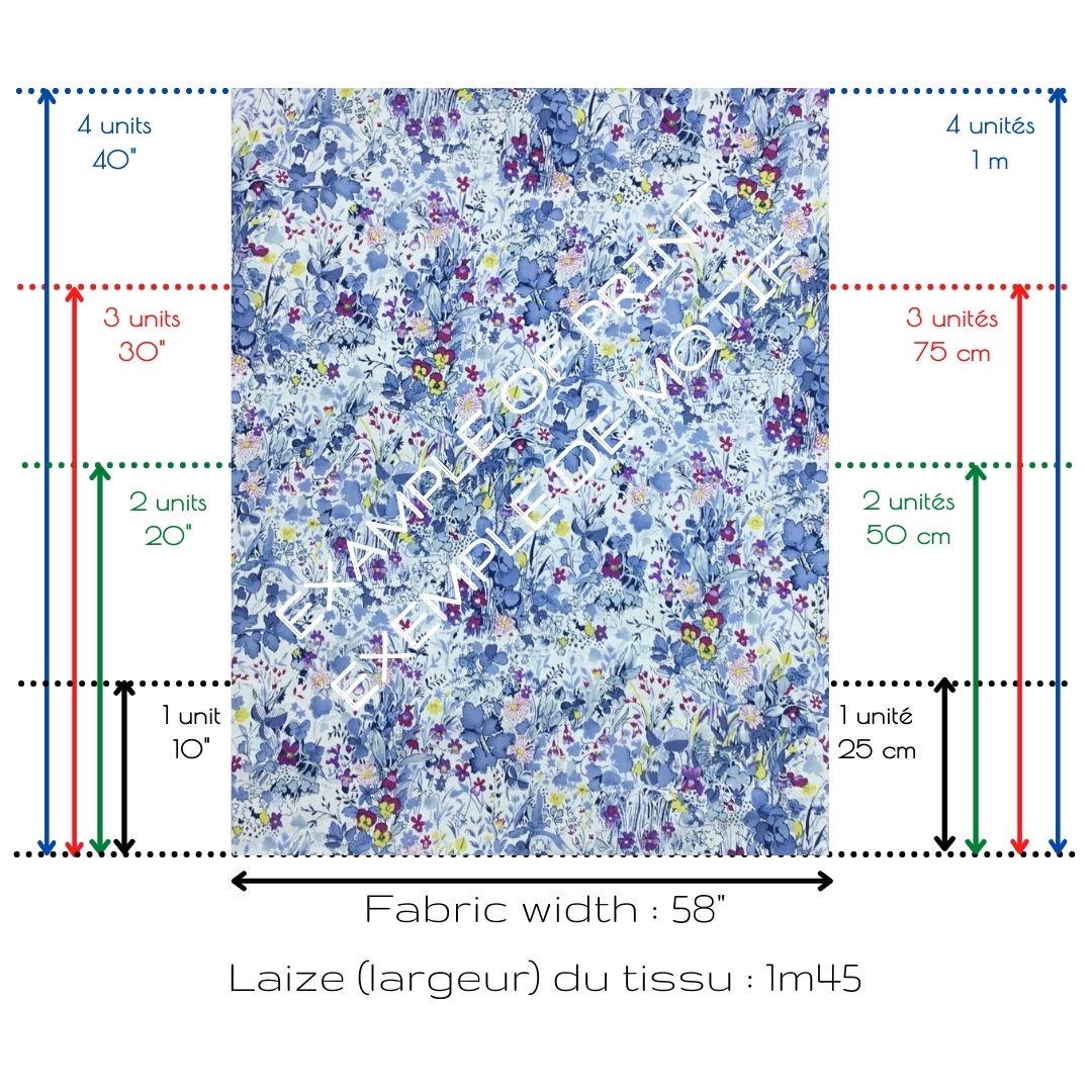The fabric is 1m45 or 58 » wide, priced and sold per 25cm (10"). If you buy more, you'll receive your fabric in one single piece. For example, if you buy two units, you'll receive a piece of fabric that is 50cm (20") long and 1m45 (58 ») in one single piece etc