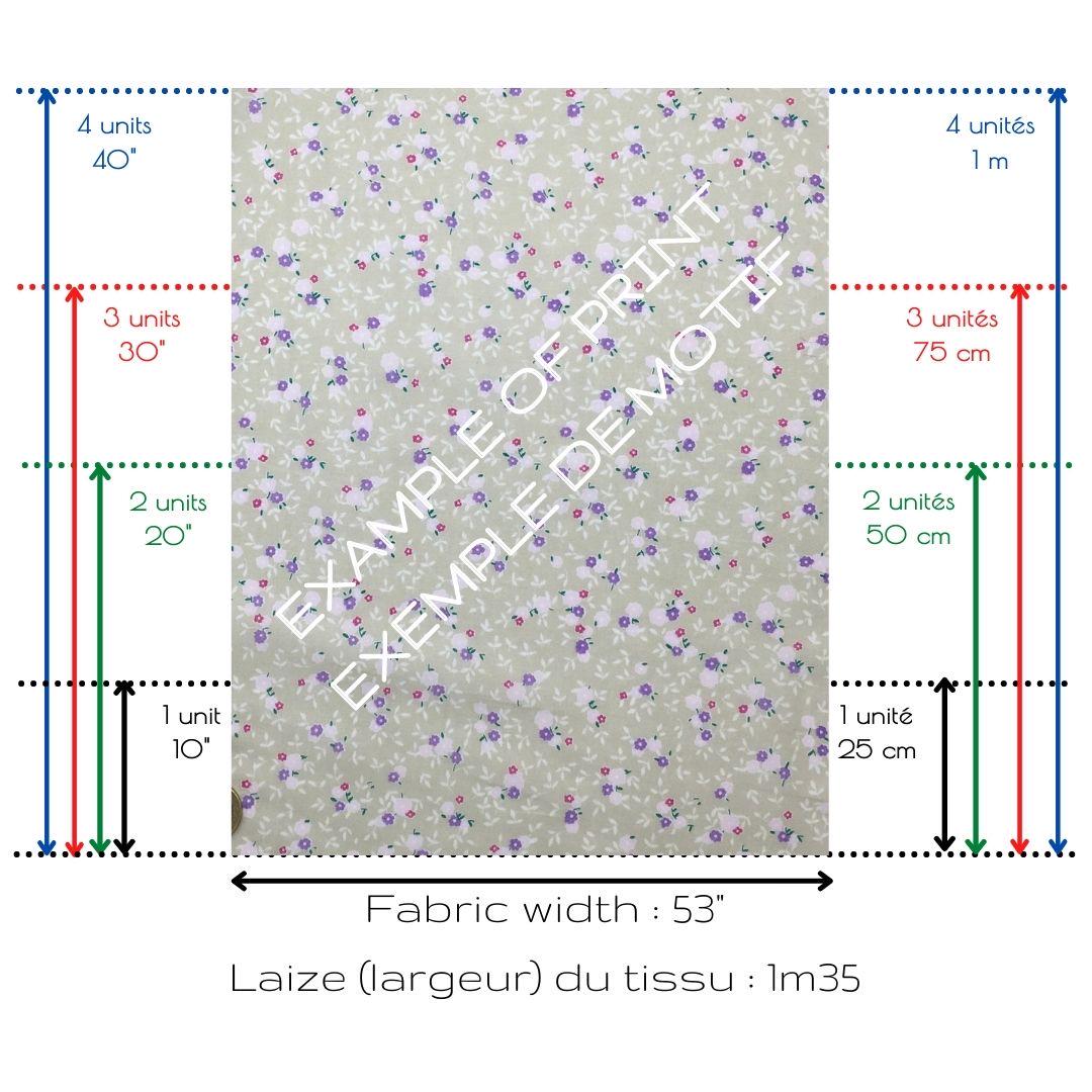 The fabric is 1m45 wide (approx 58”) and the price is for a 25cm long pièce (10"). If you buy more, you'll receive your fabric in one continuous length.