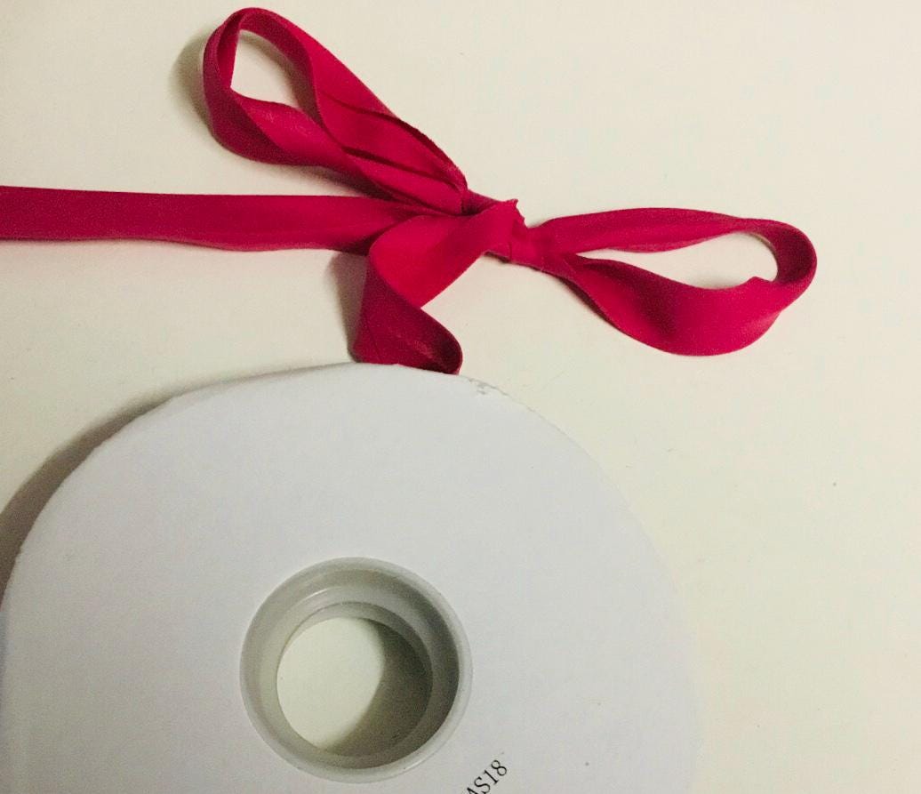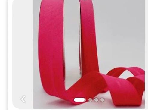 A complete roll of polycotton bias binding, 18mm wide, 9mm once applied to finish a garment.